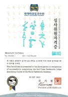 Grading examiner regulations were introduced by Kukkiwon in 2023, whereby only licensed masters are eligible to conduct grading test promotions. Previously any Kukkiwon 4 Dan (or higher) could be a grading examiner. GM Bradley successfully completed accreditation as a 1st Class Master and 1st Class Dan-Poom Examiner. His accreditation commenced with 3rd Class, conducted by Kukkiwon's World Taekwondo Academy, in Muju, South Korea, at the famous Taekwondowon. Next, GM Bradley travelled to nearby Auckland, New Zealand to complete 2nd Class Master and Poom-Dan Examiner. Finally, he completed the 1st Class course at the heart of Taekwondo, in Gangnang South Korea at Kukkiwon headquarters in the 100th Master's course and 51st Examiners course (July 2023) [footnote: only grandmasters can receive 1st Class accreditation & only high dan (6-7 Dan) can receive 2nd Class].