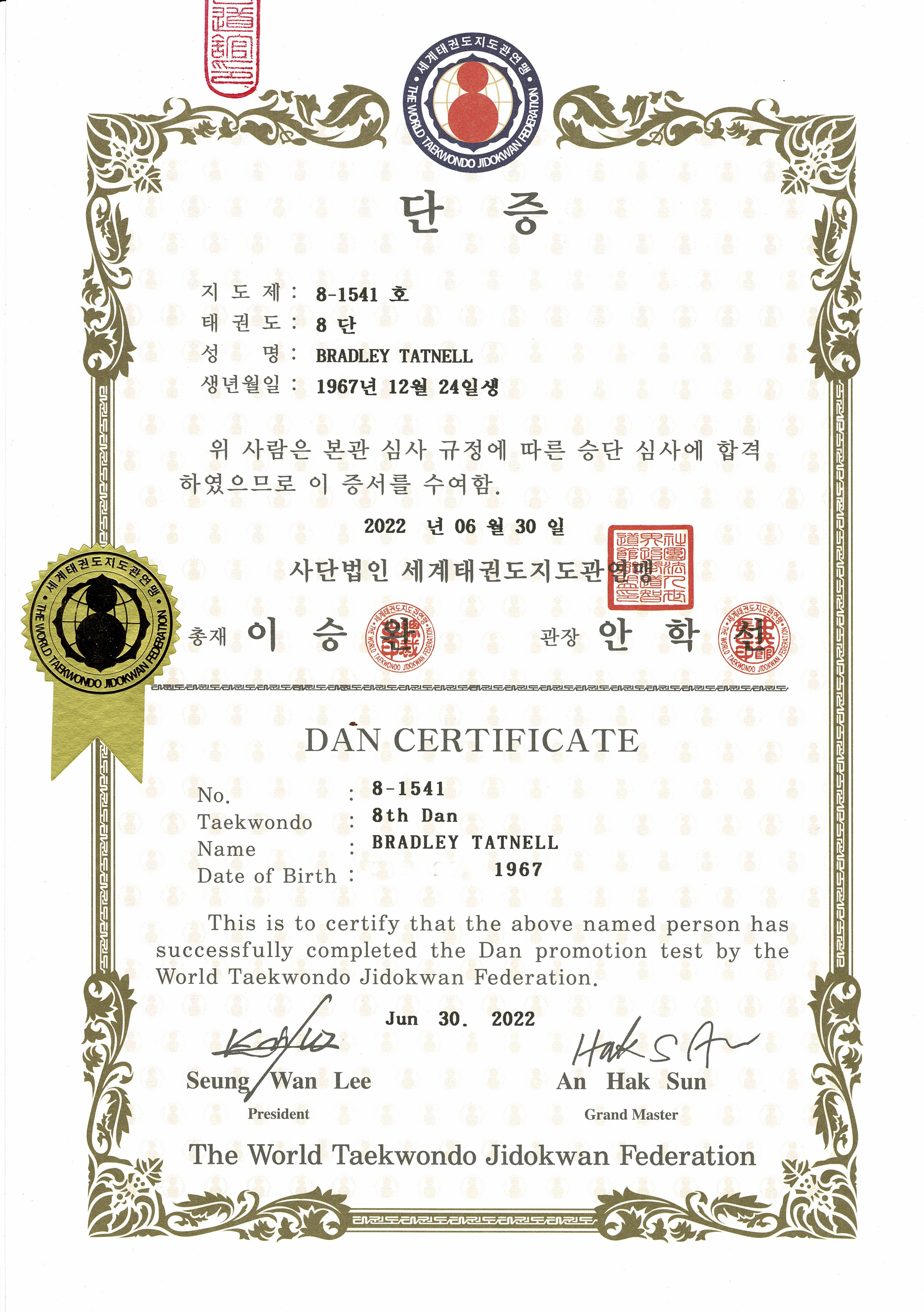 - 2022: presented with 8 Dan Taekwondo Jidokwan certificate at Jidokwan Headquarters, Gangnam, Seoul, by President Grandmaster Seung Wan Lee (이승완). Grading test conducted by Grandmaster Sung Soo Lee in Australia.