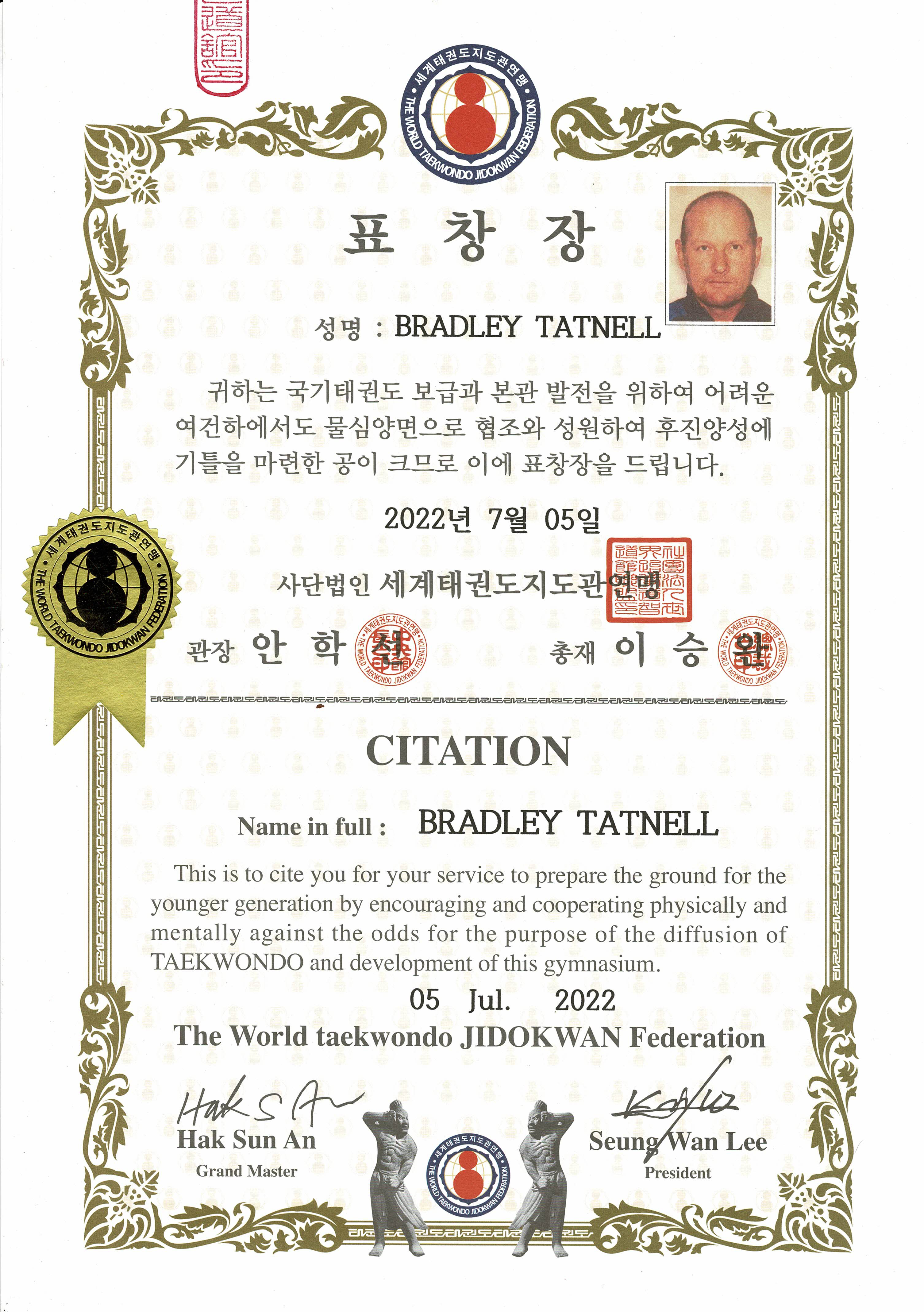 - 2022: presented with special Citation certificate at Jidokwan Headquarters, Gangnam, Seoul, by President Grandmaster Seung Wan Lee (이승완).