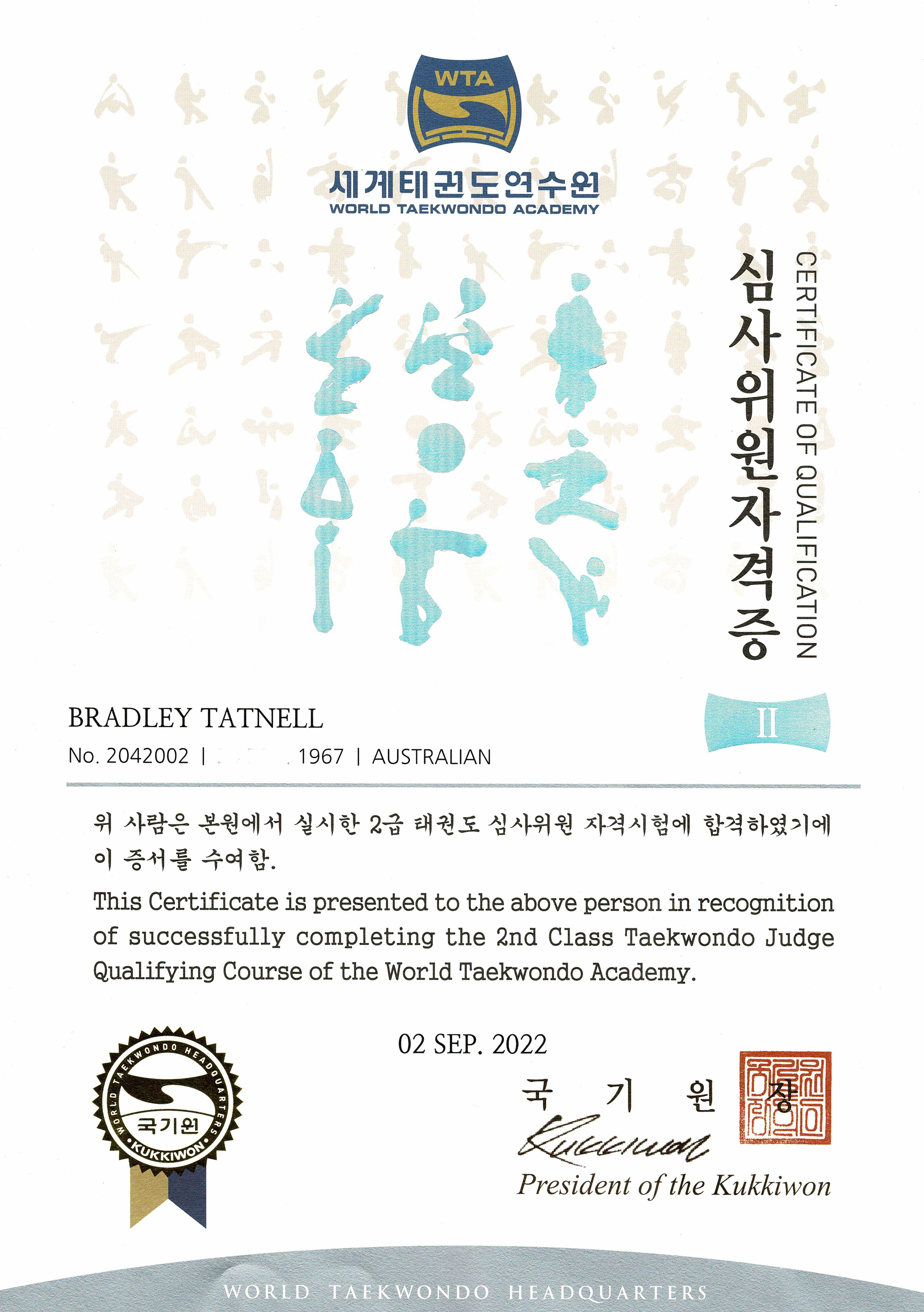 Grading examiner regulations were introduced by Kukkiwon in 2023, whereby only licensed masters are eligible to conduct grading test promotions. Previously any Kukkiwon 4 Dan (or higher) could be a grading examiner. GM Bradley successfully completed accreditation as a 1st Class Master and 1st Class Dan-Poom Examiner. His accreditation commenced with 3rd Class, conducted by Kukkiwon's World Taekwondo Academy, in Muju, South Korea, at the famous Taekwondowon. Next, GM Bradley travelled to nearby Auckland, New Zealand to complete 2nd Class Master and Poom-Dan Examiner. Finally, he completed the 1st Class course at the heart of Taekwondo, in Gangnang South Korea at Kukkiwon headquarters in the 100th Master's course and 51st Examiners course (July 2023) [footnote: only grandmasters can receive 1st Class accreditation & only high dan (6-7 Dan) can receive 2nd Class].