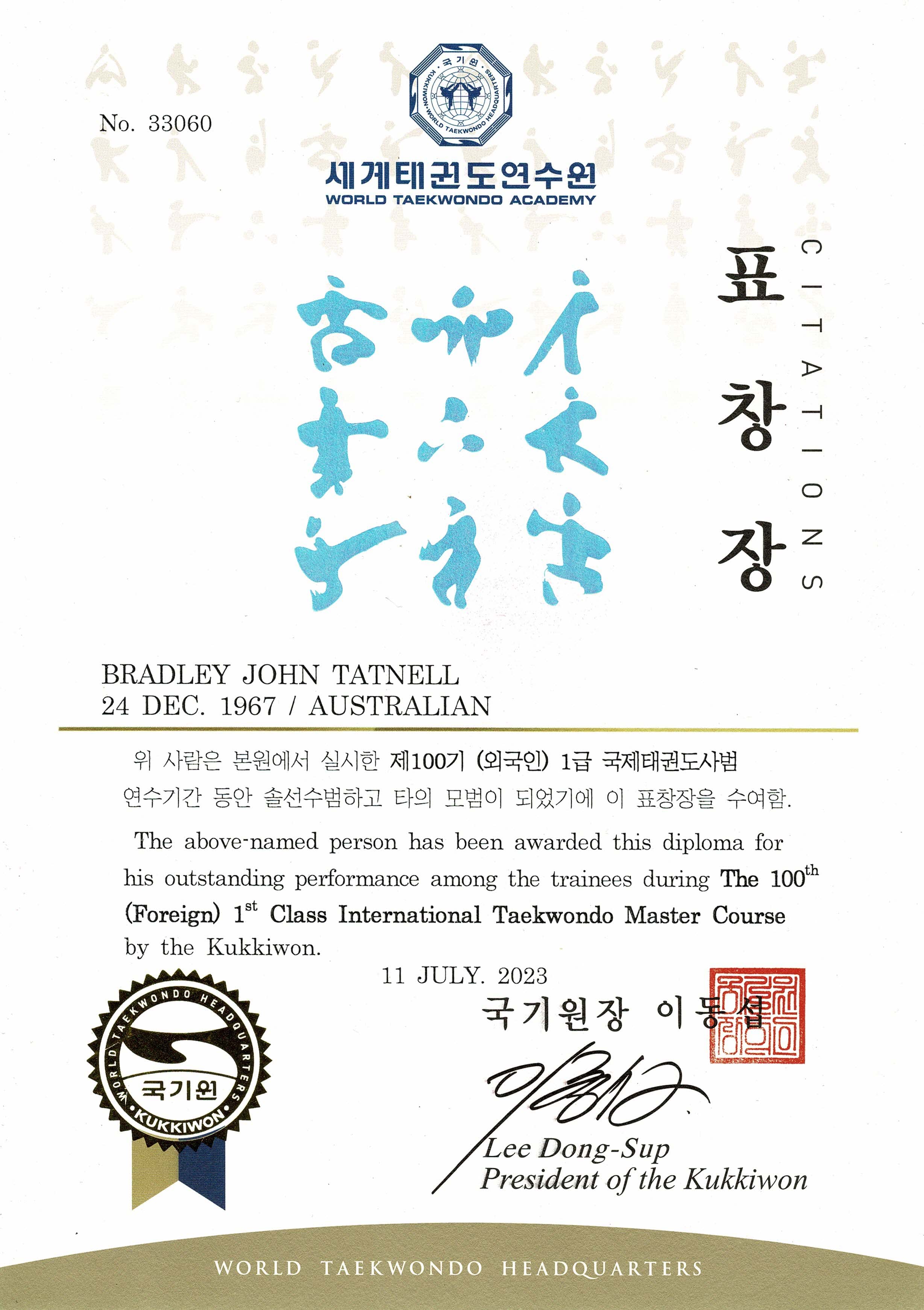 Grading examiner regulations were introduced by Kukkiwon in 2023, whereby only licensed masters are eligible to conduct grading test promotions. Previously any Kukkiwon 4 Dan (or higher) could be a grading examiner. GM Bradley successfully completed accreditation as a 1st Class Master and 1st Class Dan-Poom Examiner. His accreditation commenced with 3rd Class, conducted by Kukkiwon's World Taekwondo Academy, in Muju, South Korea, at the famous Taekwondowon. Next, GM Bradley travelled to nearby Auckland, New Zealand to complete 2nd Class Master and Poom-Dan Examiner. Finally, he completed the 1st Class course at the heart of Taekwondo, in Gangnang South Korea at Kukkiwon headquarters in the 100th Master's course and 51st Examiners course (July 2023) [footnote: only grandmasters can receive 1st Class accreditation & only high dan (6-7 Dan) can receive 2nd Class].