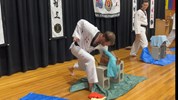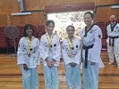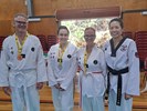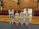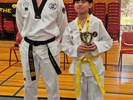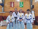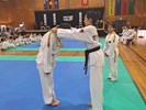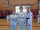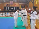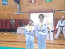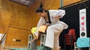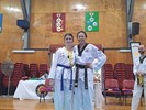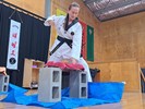 It seemed some strategy from Master Shirly Sieh (Team Kenmore) outfoxed Steph Bennett (Team Newmarket). Steph attempted five tiles, but only broke 4. Master Shirly attempted three and demolished the entire stack. Having done so, she was awarded an extra tile (based on the expectation another would have been broken). This now resulted in a tie! the tiebreaker is decided on weight, the lightest player awarded the win. Congrats to Master Shirly for the gold!