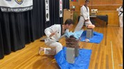 Master Ben Vickery (Team The Gap) had taken down a full stack of eight tiles in 2024, so we we wondering why he only had seven stacked this year. Not sure what happened, but the last tile refused to break. Six tiles was enough for gold though!