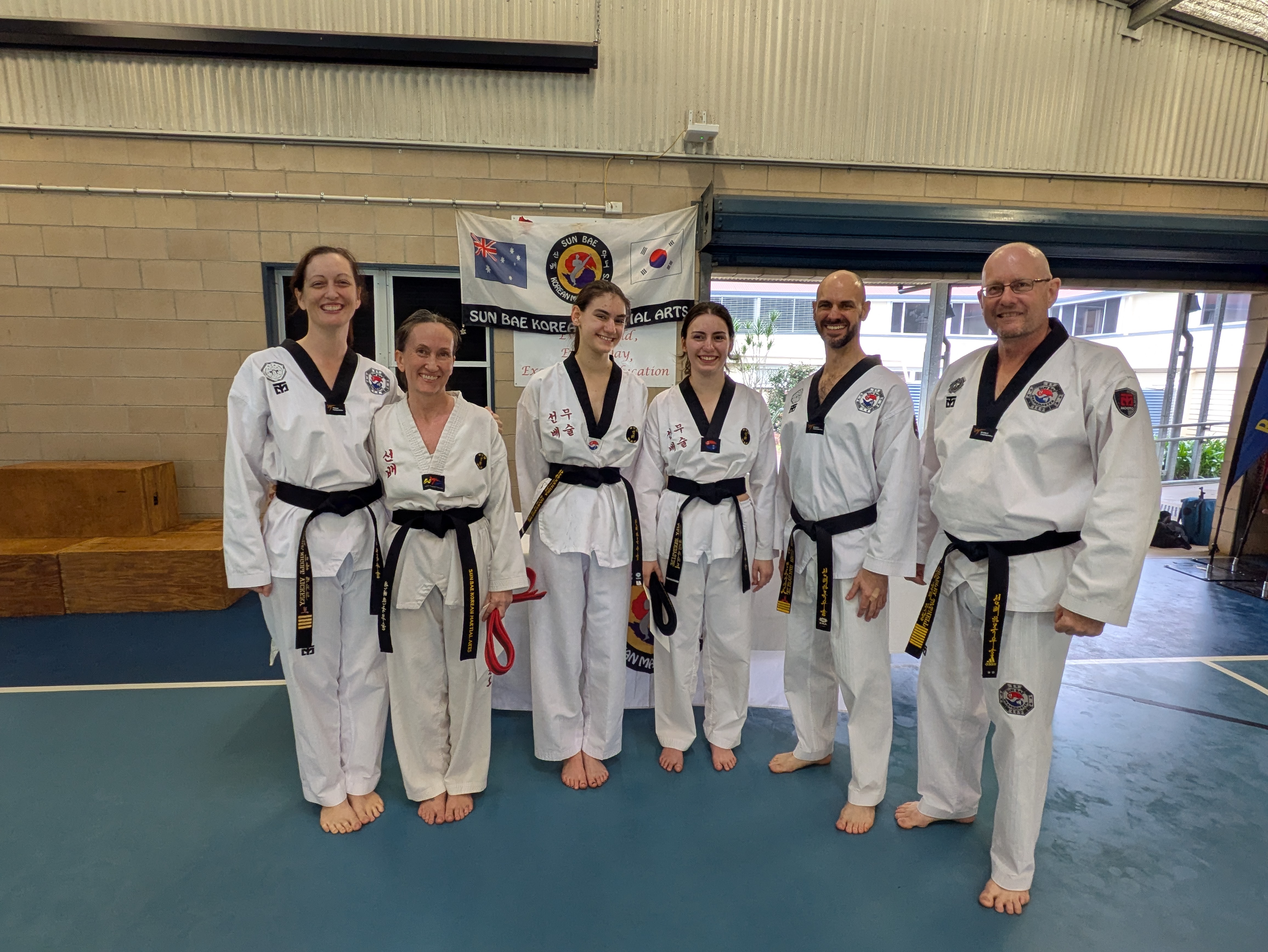 Above: Successful Black Belt applicant from the Dan gradings in Toowoomba with Grand Master Bradley, Instructors John and Nicole. Including our brand new Black Belt, Claire.